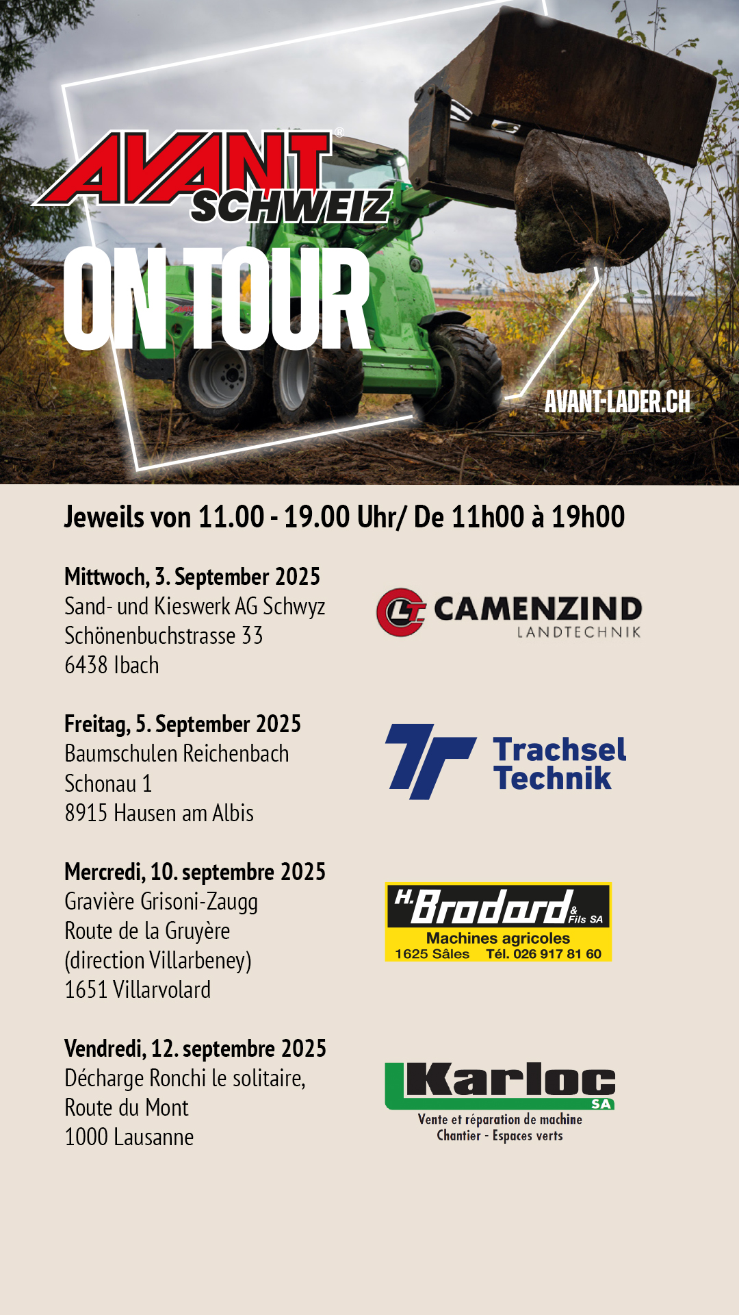 AVANT Suisse te présente, en collaboration avec les concessionnaires locaux, les derniers modèles de chargeuses multifonctions AVANT avec une multitude d'outils portés ! Tu as la possibilité de tester les chargeuses multifonctions AVANT ! N'hésite pas à nous rendre visite à l'un des 4 arrêts de la tournée !