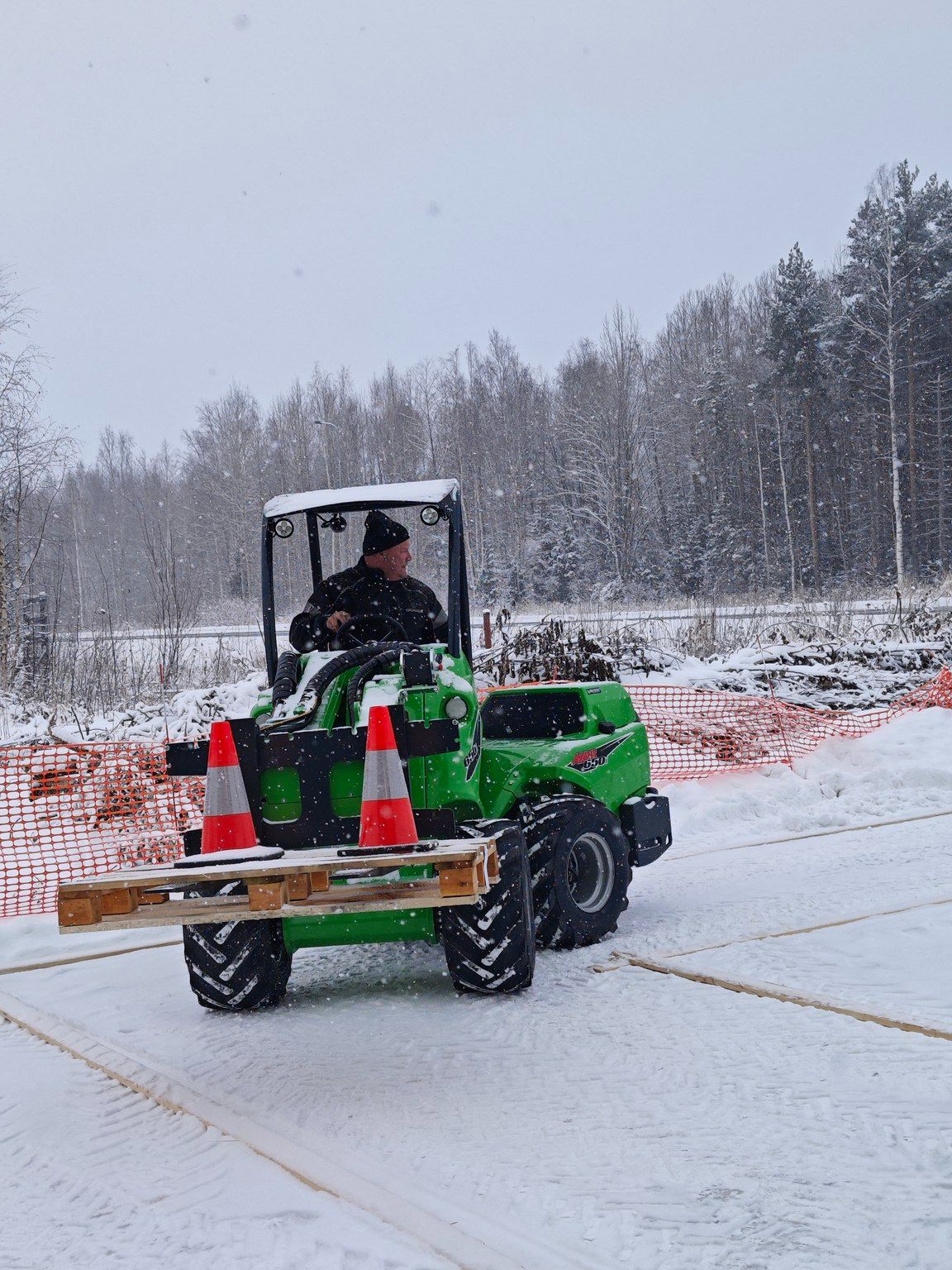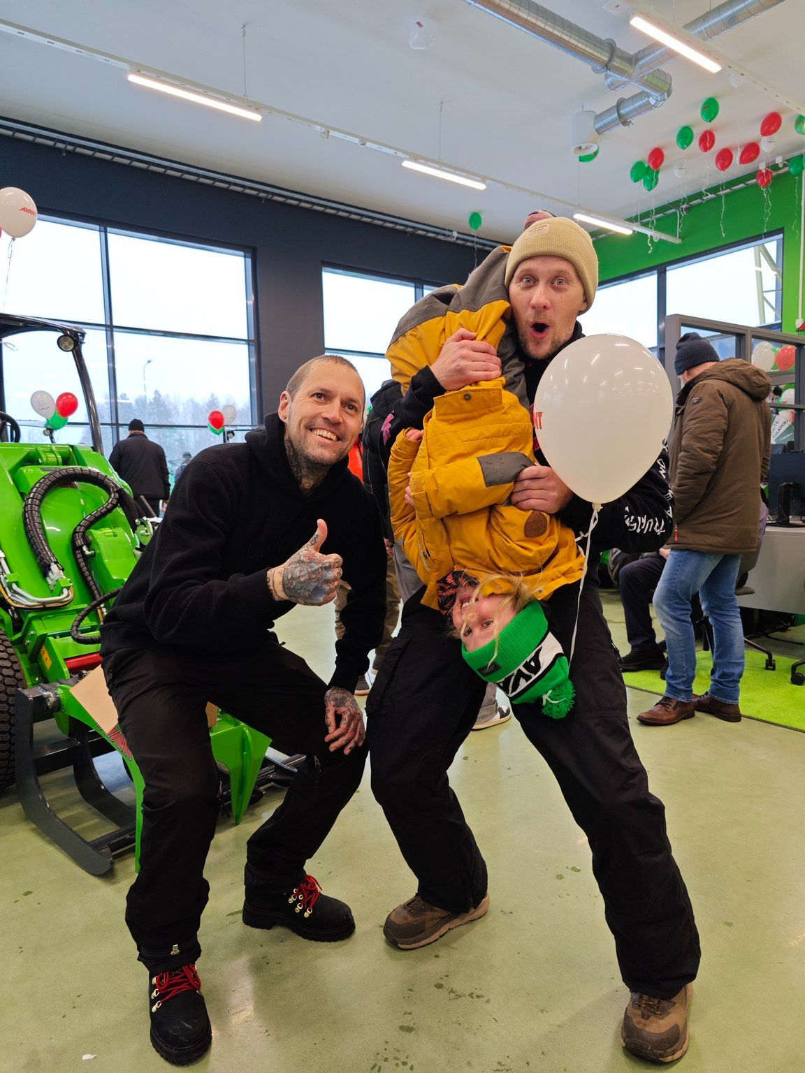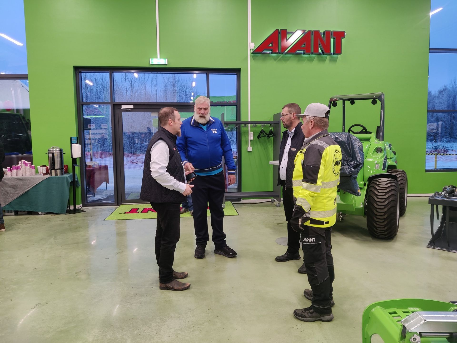 Perjantaina valtaosa kävijöistä oli ammattilaisia, ja lauantain perhepäivässä saatiin kone-esittelyjen lisäksi nauttia hauskasta oheisohjelmasta. Pihamaalle rakennetulla Avant-taitoajoradalla nähtiin Duudsoneista tutut HP Parviainen (kuvassa vasemmalla) ja Jarno Laasala (oikealla), jotka ottivat mittaa paitsi avajaisvieraista, myös toimitusjohtajastamme Jani Käkelästä (toinen vasemmalta). Vanhana rattimiehenä Jani selvitti radan nopeimmin, mutta Duudsoneillakin pysyi ketterästi kääntyvä kuormaaja upeasti hanskassa. Kuvassa myös pitkäaikainen Avant-asiakas ja Duudsonit Activity Parkin toimitusjohtaja Jari Saari (toinen oikealta).